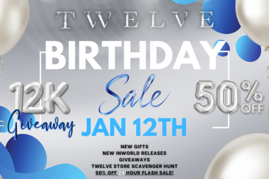 Celebrate with us for TWELVE’s Birthday Sale – a one-day event packed with exclusive rewards & major savings. Discover brand-new in-world releases & gifts, join our in-world group for a chance to win the 12K giveaway & take part in the TWELVE Store Gift Card Scavenger Hunt. To top it off, enjoy a 50% off… Read More »GET READY TO POP THE BALLOONS FOR TWELVE’S BIRTHDAY SALE