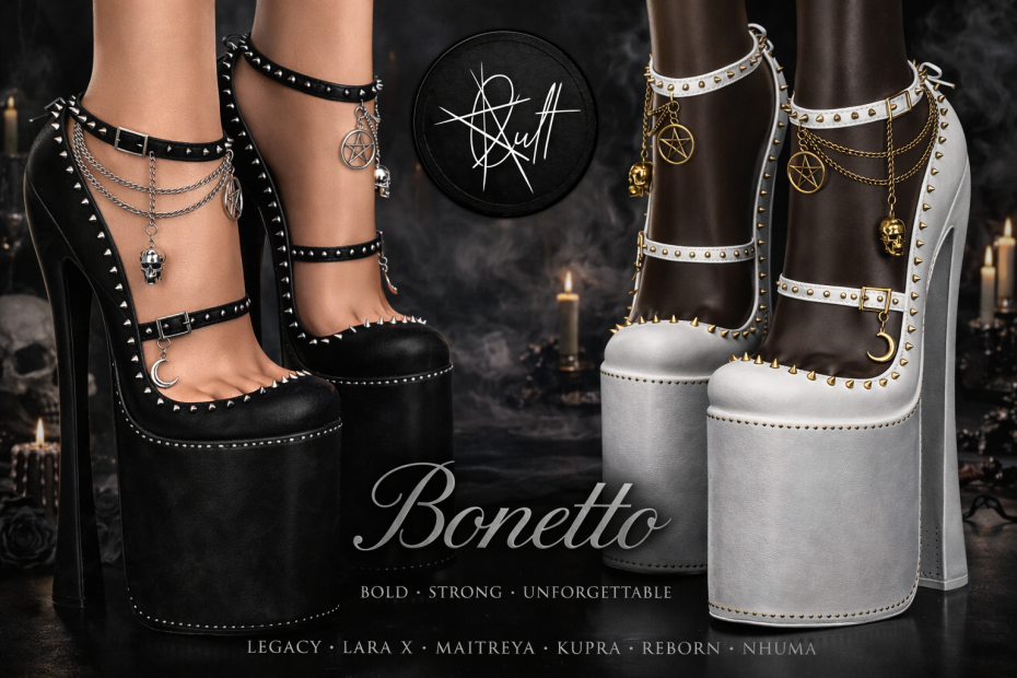 The Bonetto heels are sleek and sexy with chains, spikes and charms! These are rigged for Lara, Legacy F, MaitreyaX, Reborn, Kupra, and Nhuma. Also comes with a Fatpack color hud! The Sabbath event opens April 21st! SABBATH EVENT | CULT MAINSTORE | CULT MARKETPLACE | CULT PRIMFEED | CULT FLICKR GROUP