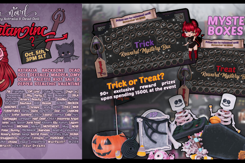 TRICK? TREAT? TRY BOTH: WELCOME TO SATAN INC!by AllyOctober 5, 2025Events STARTS: OCTOBER 5TH | ENDS: NOVEMBER 1ST | TREAT SIM | TRICK SIM Share this: Click to share on Facebook (Opens in new window) Facebook Click to share on X (Opens in new window) X Tags:2025AllyAnnual EventBelvieBelvie LexingtonHalloween 2025Novel EventsNovel Events Satan IncSatan IncSecond LifeSecondLifeshoppingSLSugarSugarSLSwamp WitchTreatTrickTrick or Treat previousBONFIRE NIGHTS AND SPOOKY DELIGHTS AT VOGUE EVENTnextBEXLEY BY CULT HITS TMD WITH SERIOUS ATTITUDE!